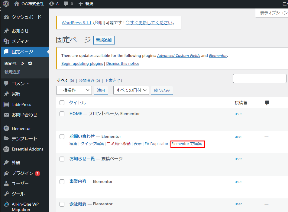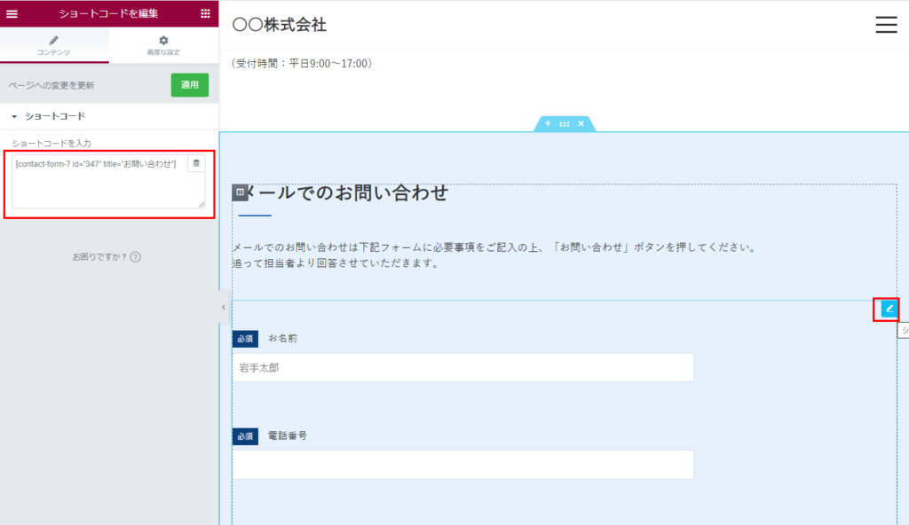 ダッシュボード>固定ページ>「お問い合わせ」をElementorで編集から開く