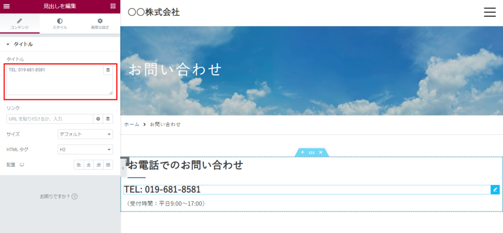 TEL:の部分をクリックし、左側の画面から電話番号を編集します