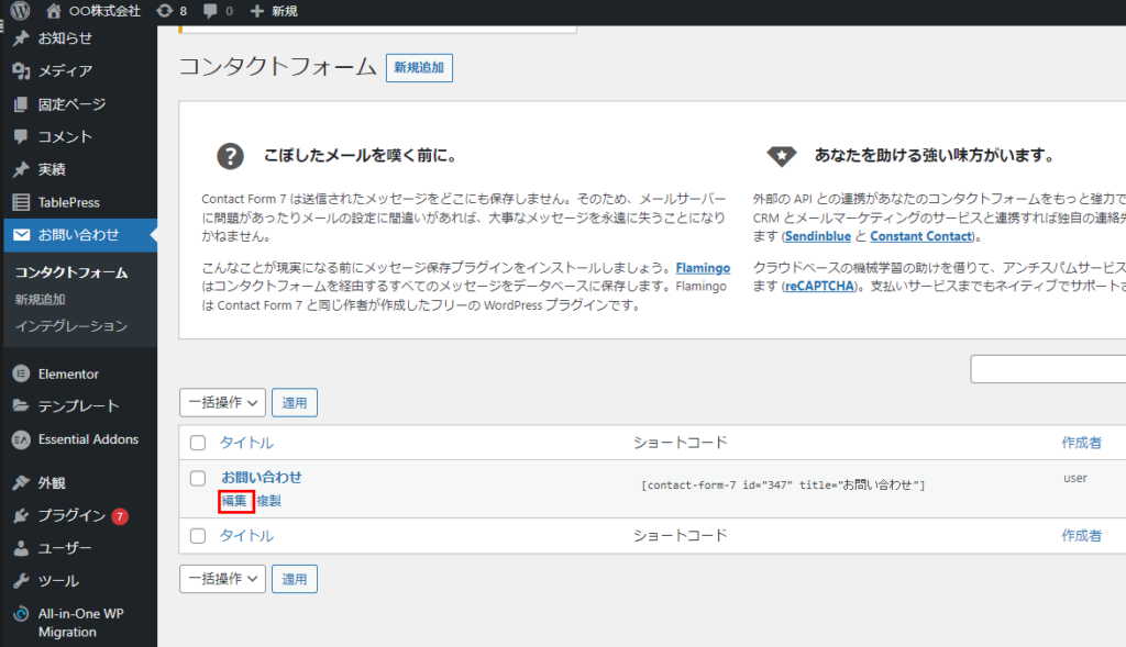 お問い合わせフォームはElementor上では、編集できません。