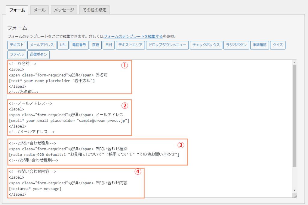 ①~④の部分が、それぞれのフォーム内容になります。
