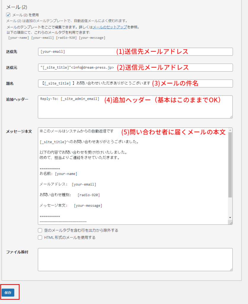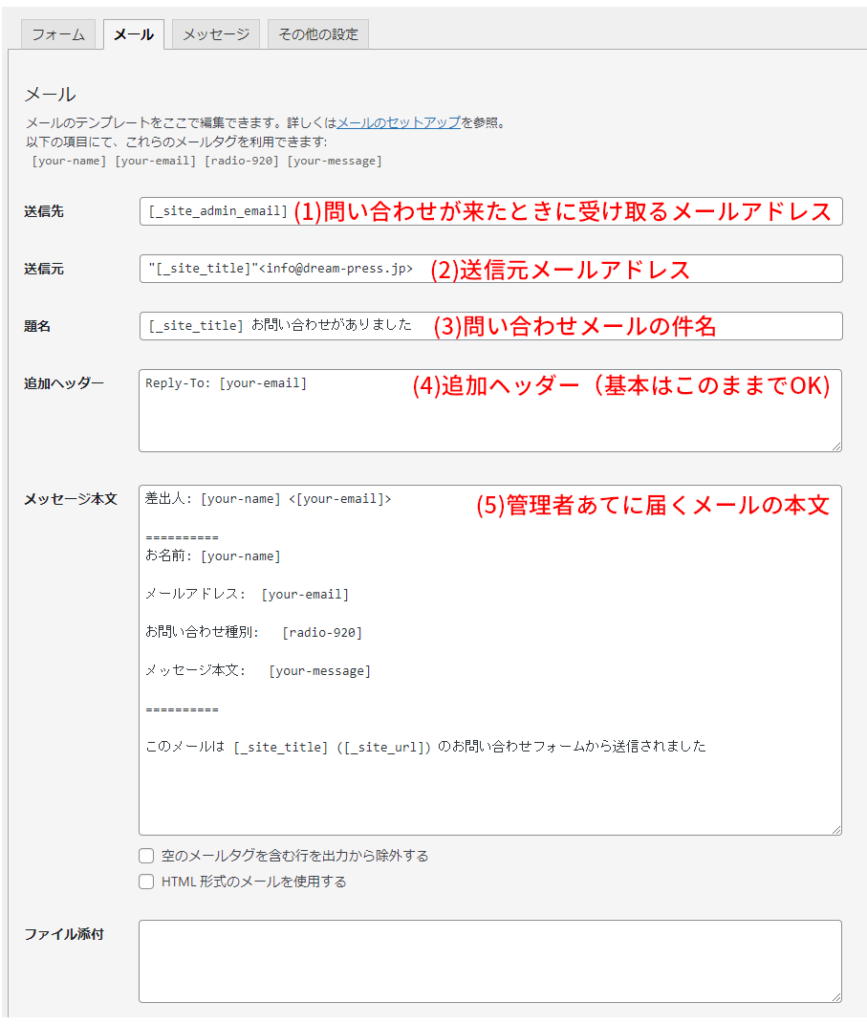 (1)送信先…問い合わせが来たときに受け取るメールアドレス