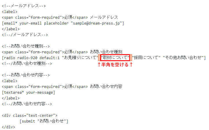すでにある「お問い合わせ種別」に「取材について」などの項目を追加する場合は、