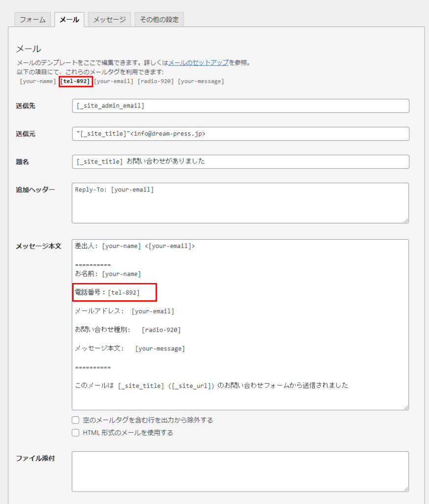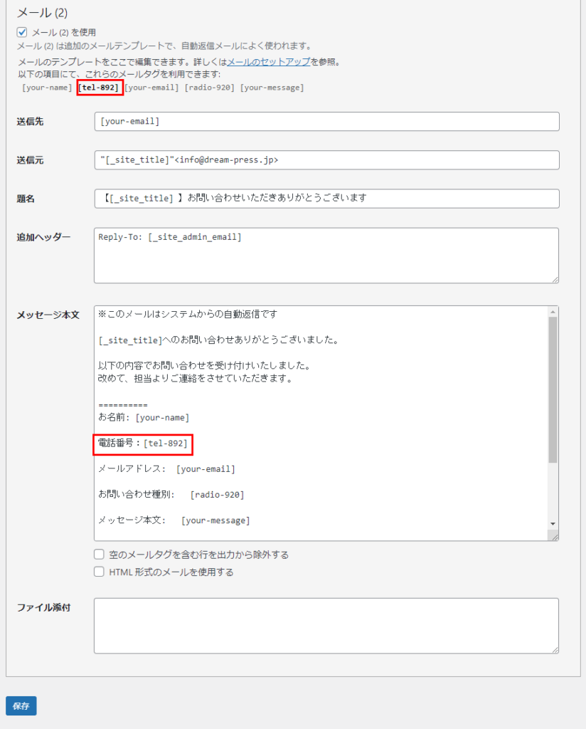 電話番号:[tel-892](メールタグ)を【管理者あてに届くお問い合わせメールの設定】、 【問い合わせ者に届く自動送信メールの設定】 どちらにも追加します。