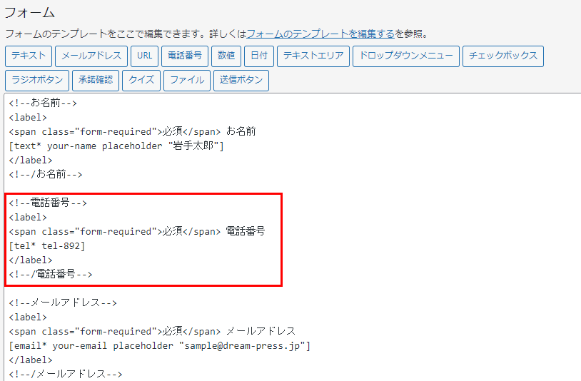 電話番号の入力欄を追加する場合は以下の動画を参考に追加してください。