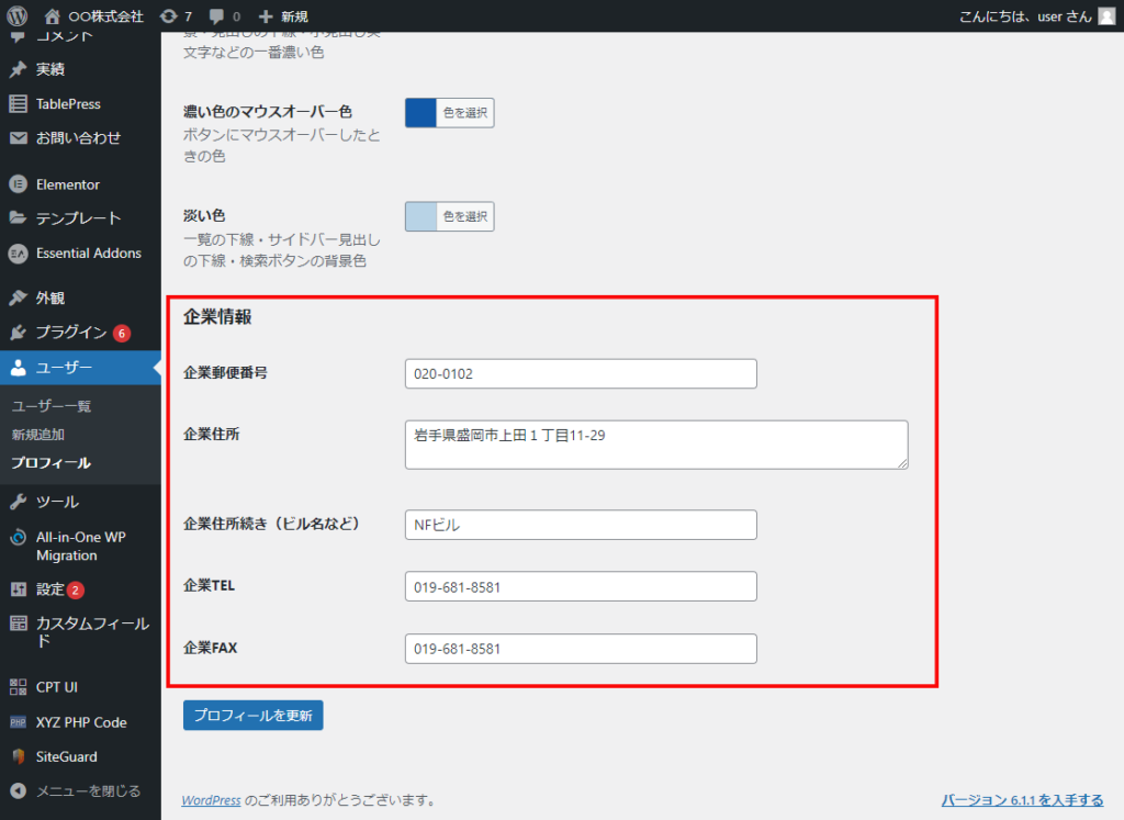 「企業情報」 の内容を差し替えて、「プロフィールを更新」ボタンをクリック