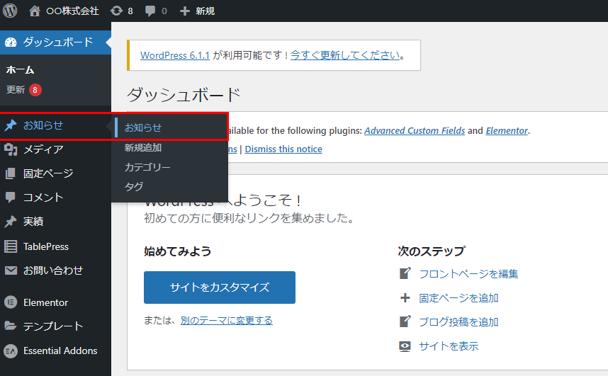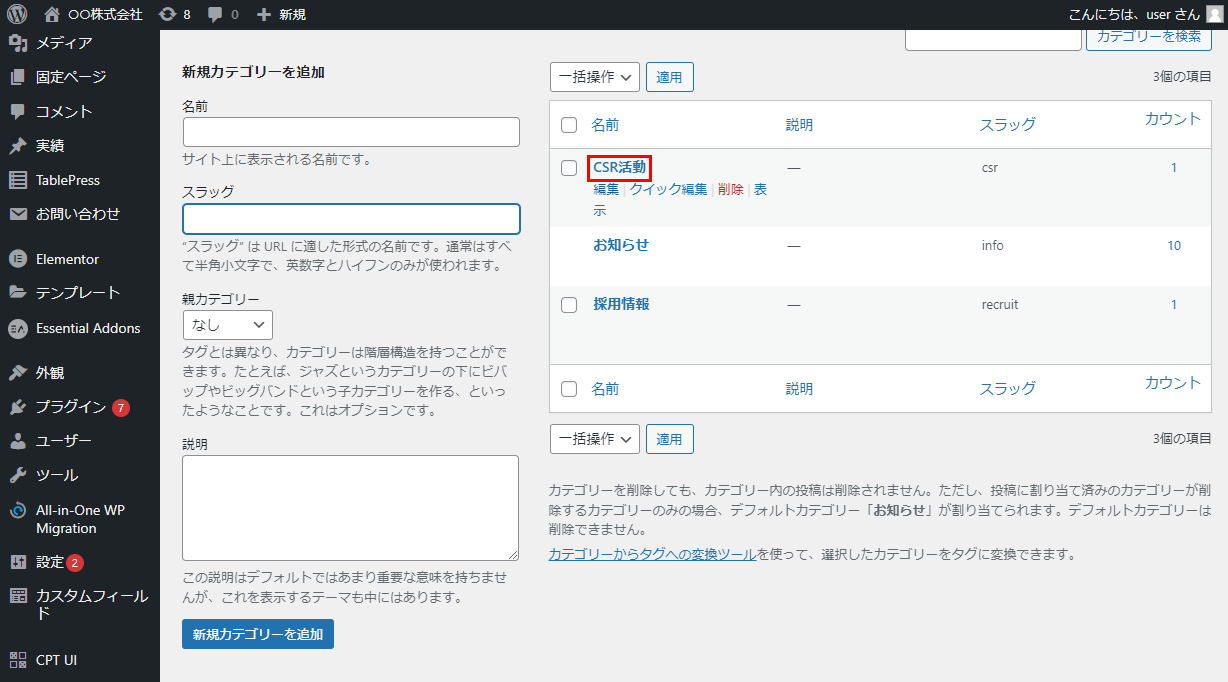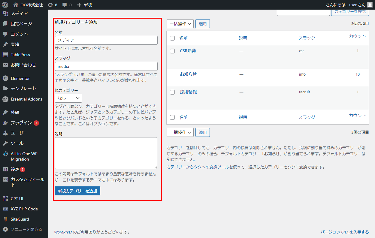 新規カテゴリーを追加する場合は、左側の「新規カテゴリーを追加」から任意のカテゴリーを追加します
