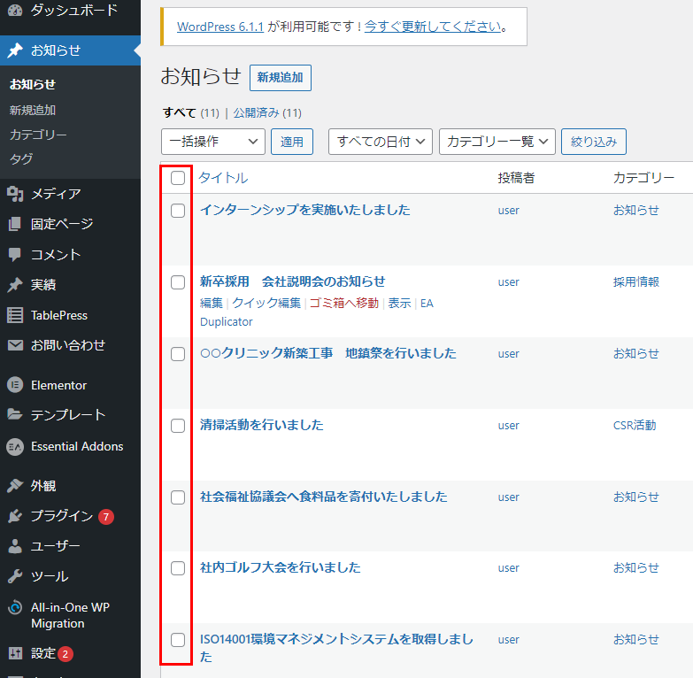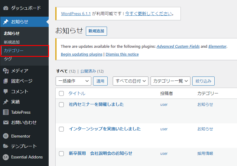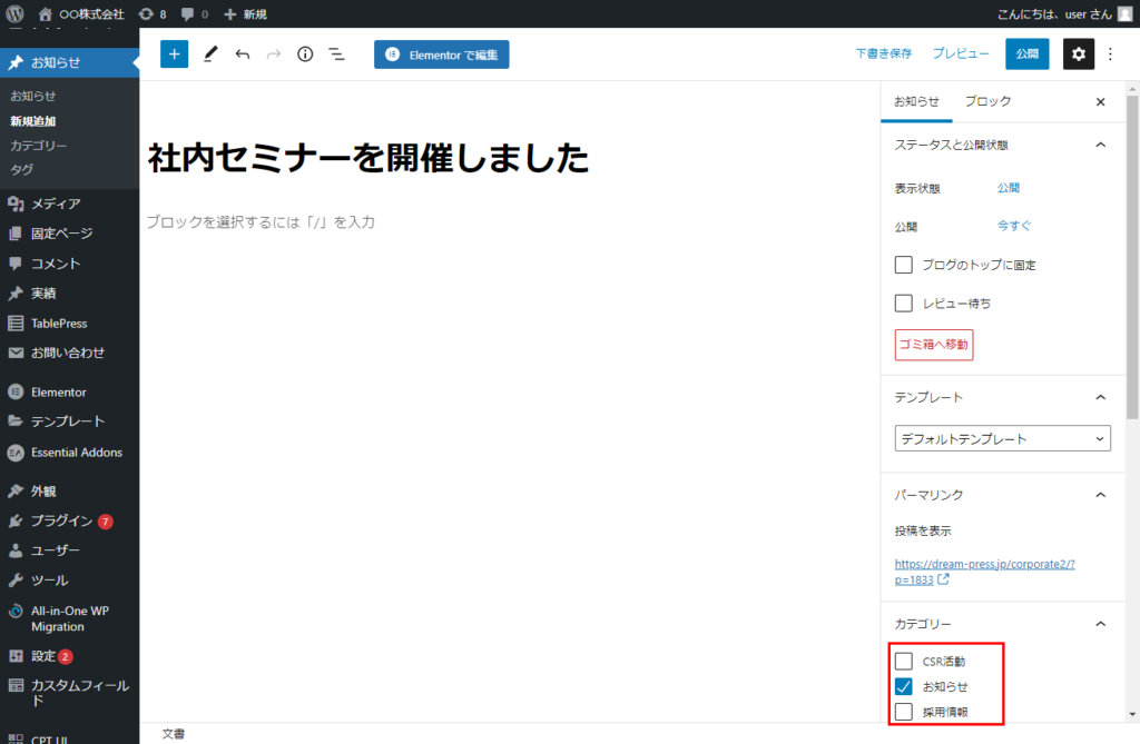 右下の「カテゴリー」から該当のカテゴリーに☑を入れます
