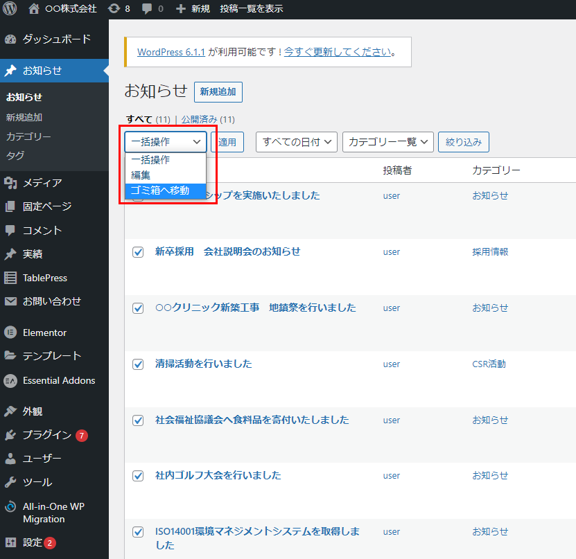 一括で操作する場合は、プルダウンから「ゴミ箱へ移動」を選択で削除可能です