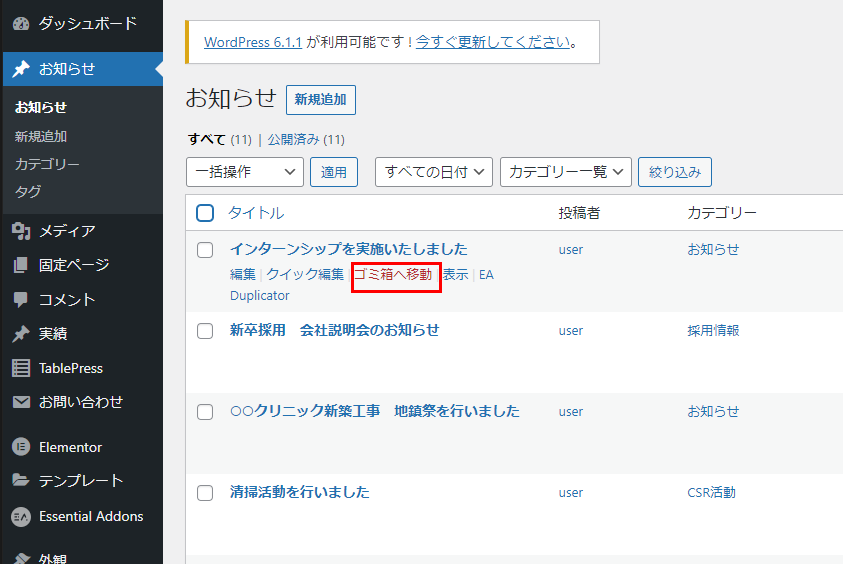 一件ずつ削除する場合は、タイトル下の「ゴミ箱へ移動」をクリックします