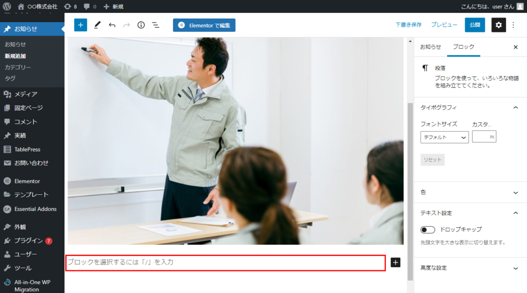 文章を入力する場合は、 「ブロックを選択するには「/」を入力」部分にカーソルを合わせて入力します