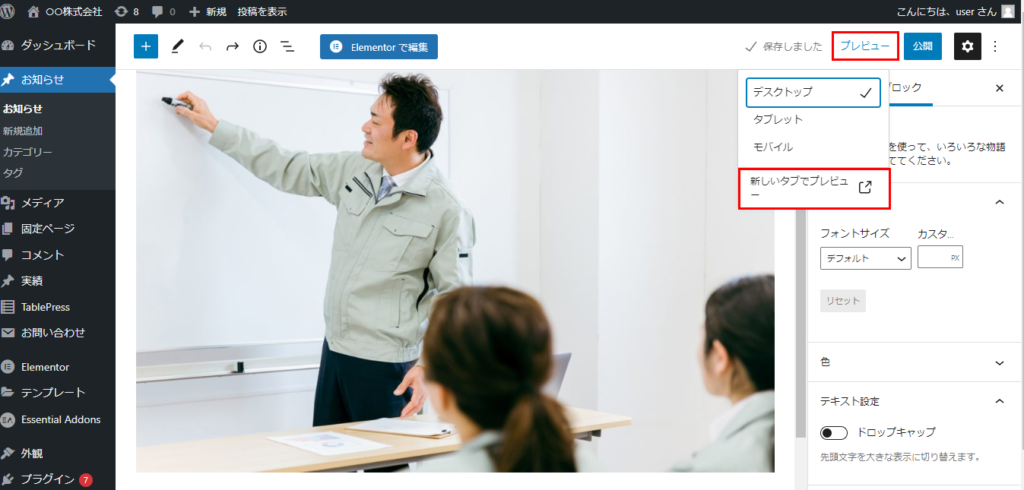 プレビューボタンから「新しいタブでプレビュー」をクリック