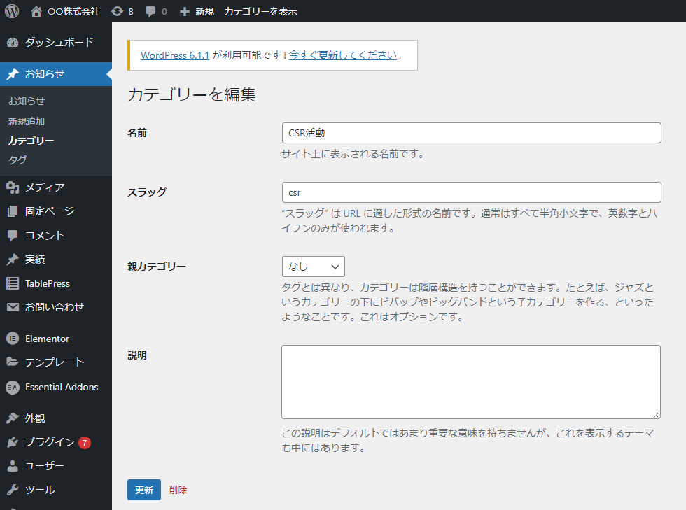 カテゴリーを編集する場合は、カテゴリー名をクリック(削除する場合は、各カテゴリーの名前の下の「削除」をクリックします)