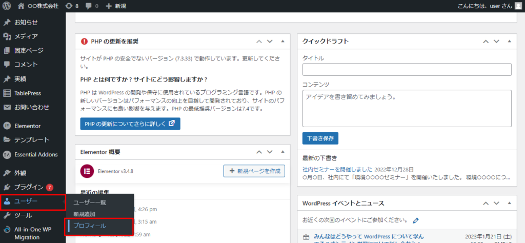 ダッシュボード>ユーザーを開く