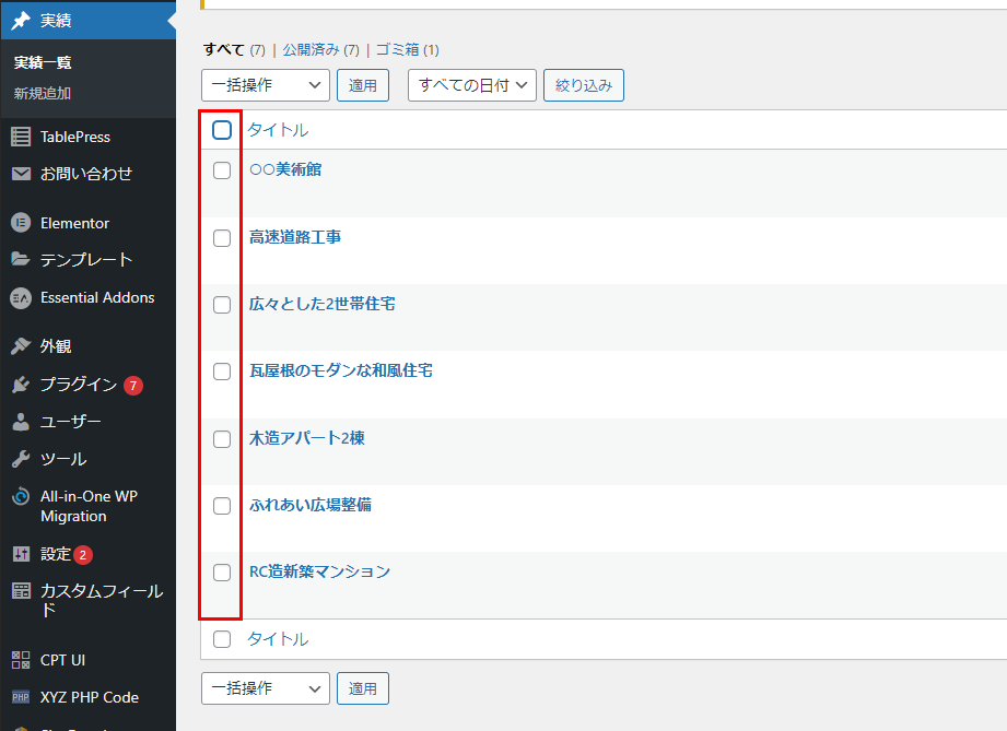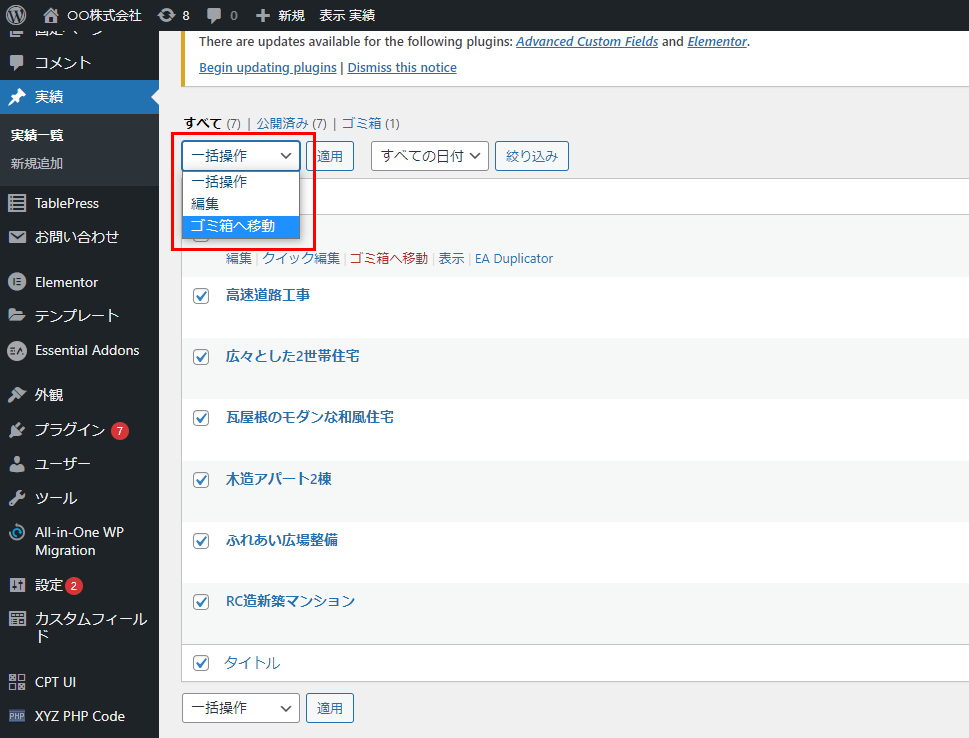 一括で操作する場合は、プルダウンから「ゴミ箱へ移動」を選択で削除可能です