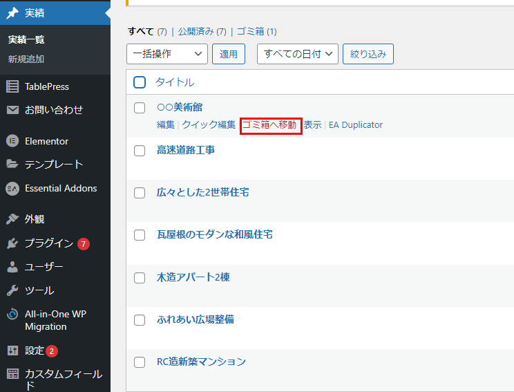 一件ずつ削除する場合は、タイトル下の「ゴミ箱へ移動」をクリックします
