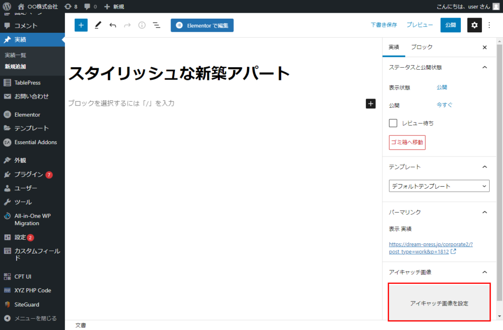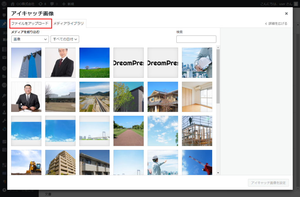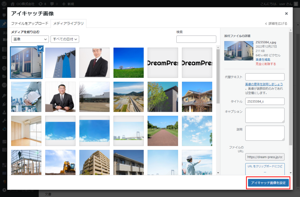 アップロードされるので、そのまま「アイキャッチ画像を設定」ボタンをクリック
