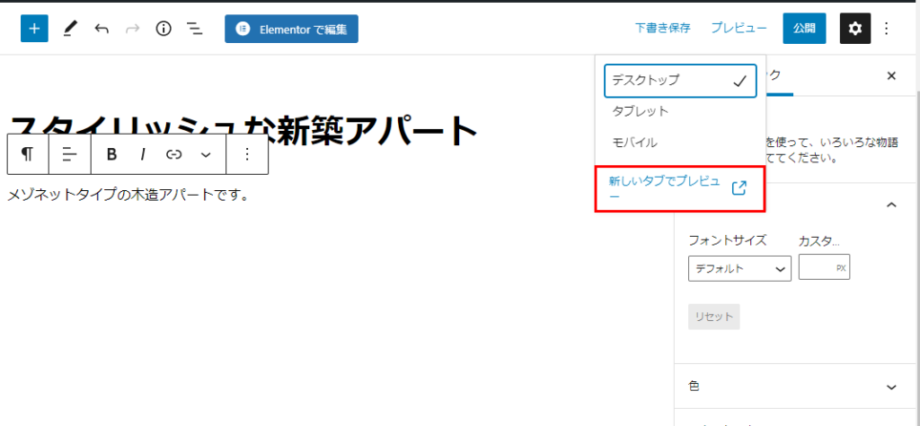 プレビューボタンから「新しいタブでプレビュー」をクリック