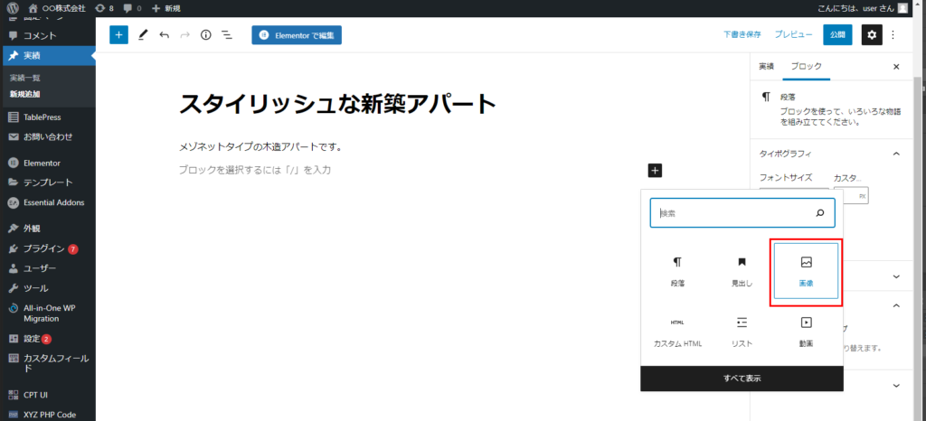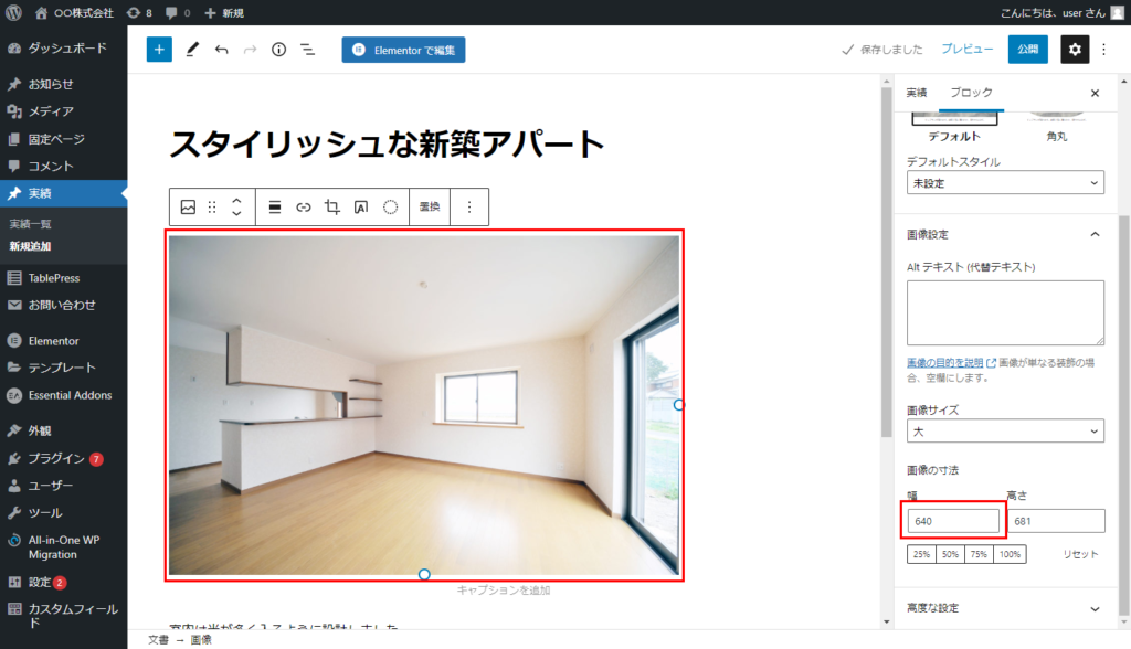 画像の表示サイズを調整したいときは、画像をクリックし右画面から幅を入力します